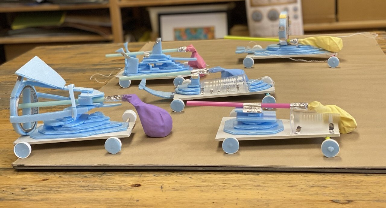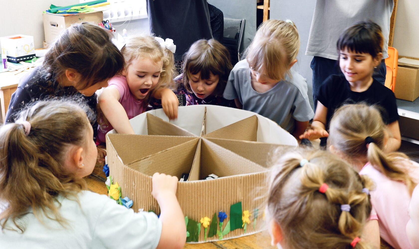 Насыщенная программа вместила в себя изготовление фенакистископа (покадровая анимация на вращающемся круге), мобильных игрушек (вертолёт с резиновым двигателем, автомобиль с двигателем из воздушного шара). Не упустили и живопись: создали цветочную поляну мастихином и украсили шоперы в технике штампа и свободной росписи.