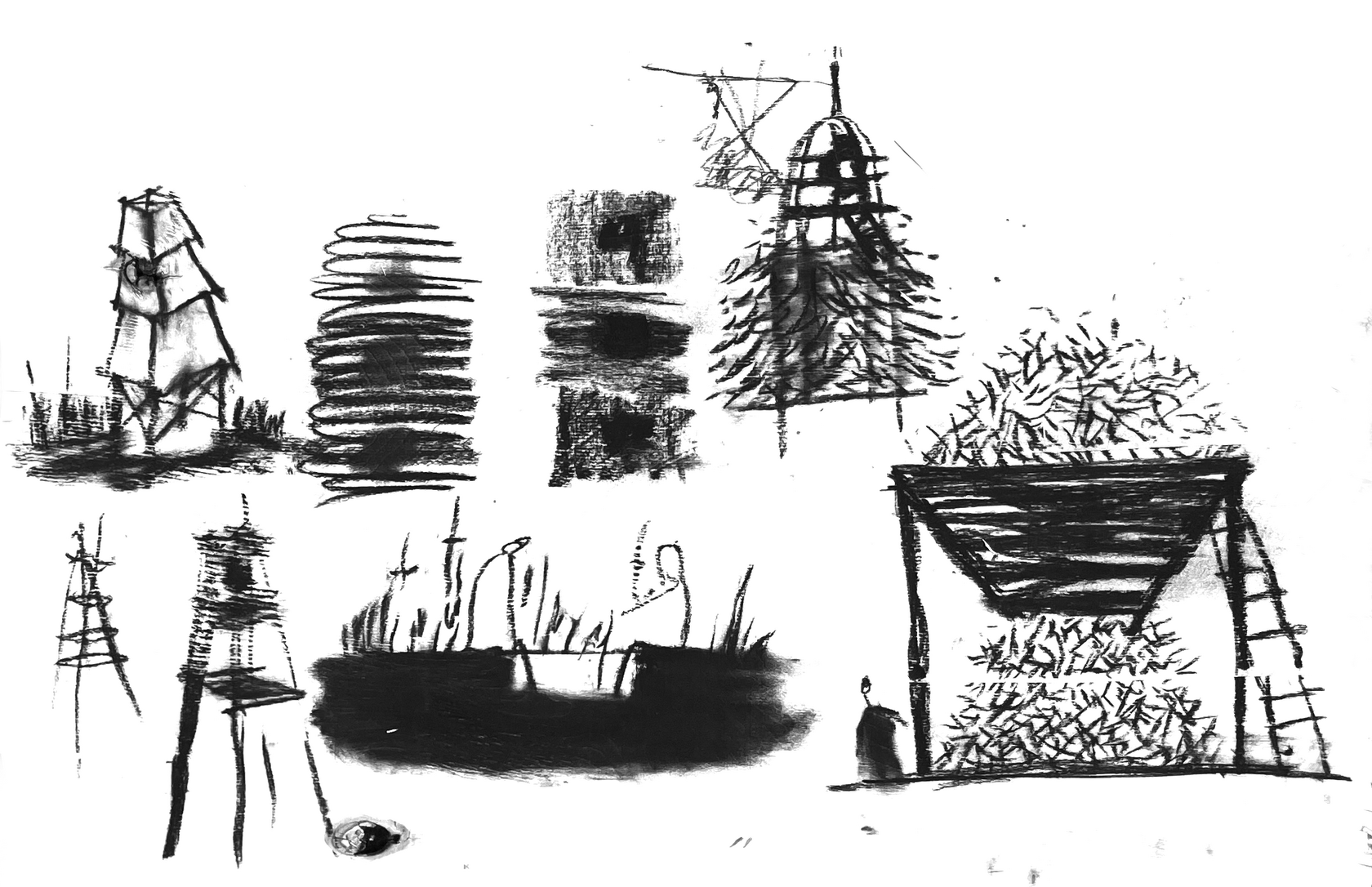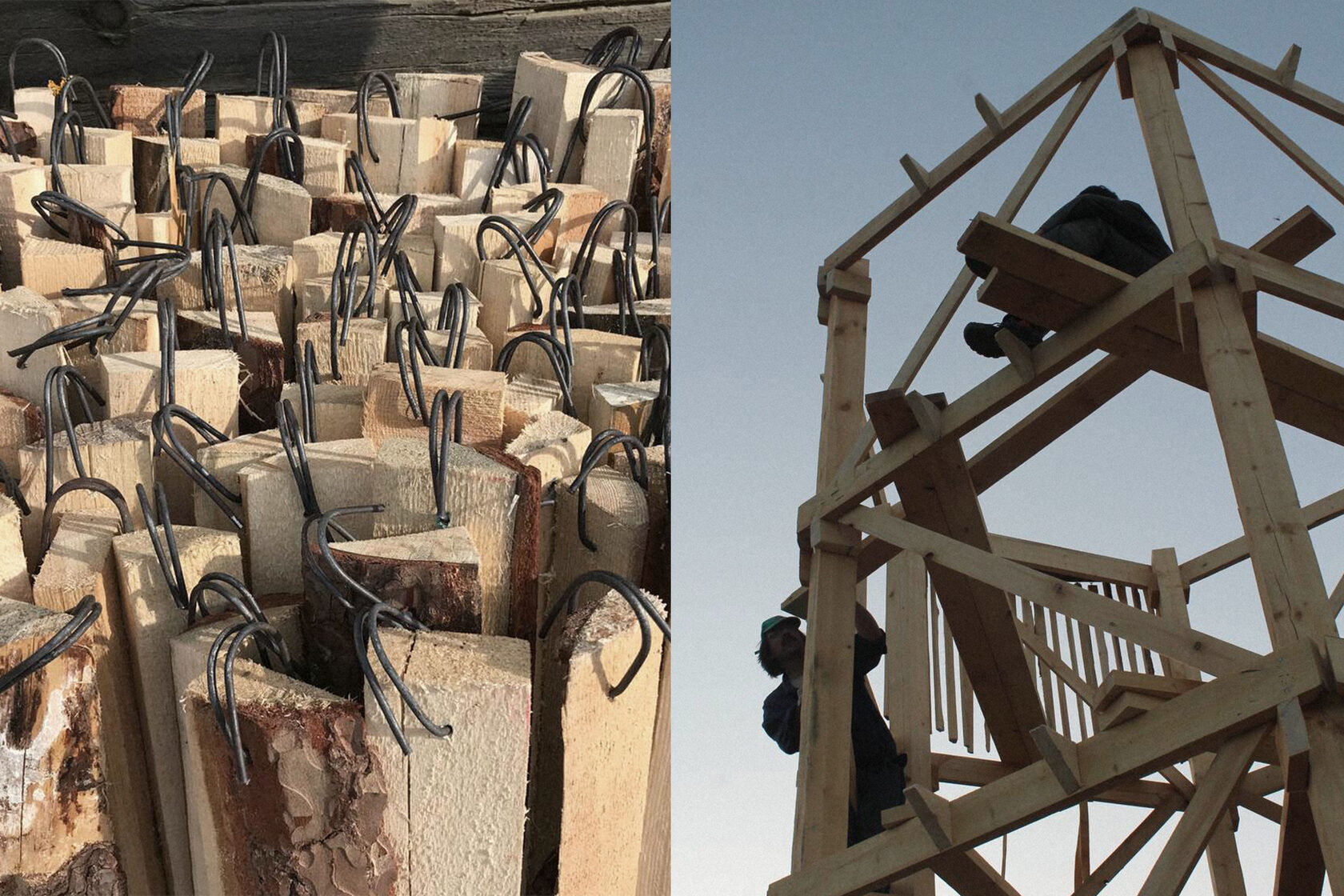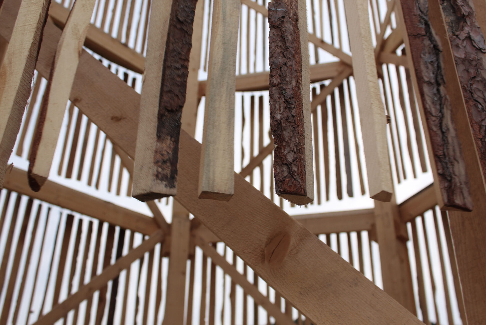Затем 9 жарких летних дней наша команда трудилась на лугу и в тылу, на пилораме. Мы таскали брусья, пилили доски, с любовью подбирали каждую из пятисот палочек горбыля. На лугу проводили разметку, бурили лунки, с огромным упорством возводили каркас башни, который вскоре оброс подвижной оболочкой из сотен подвесных элементов, которые бьются друг о друга, звучат и играют с ветром.
